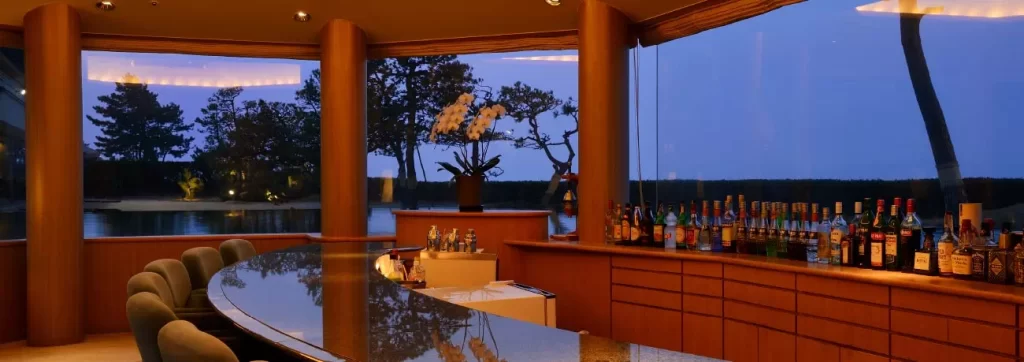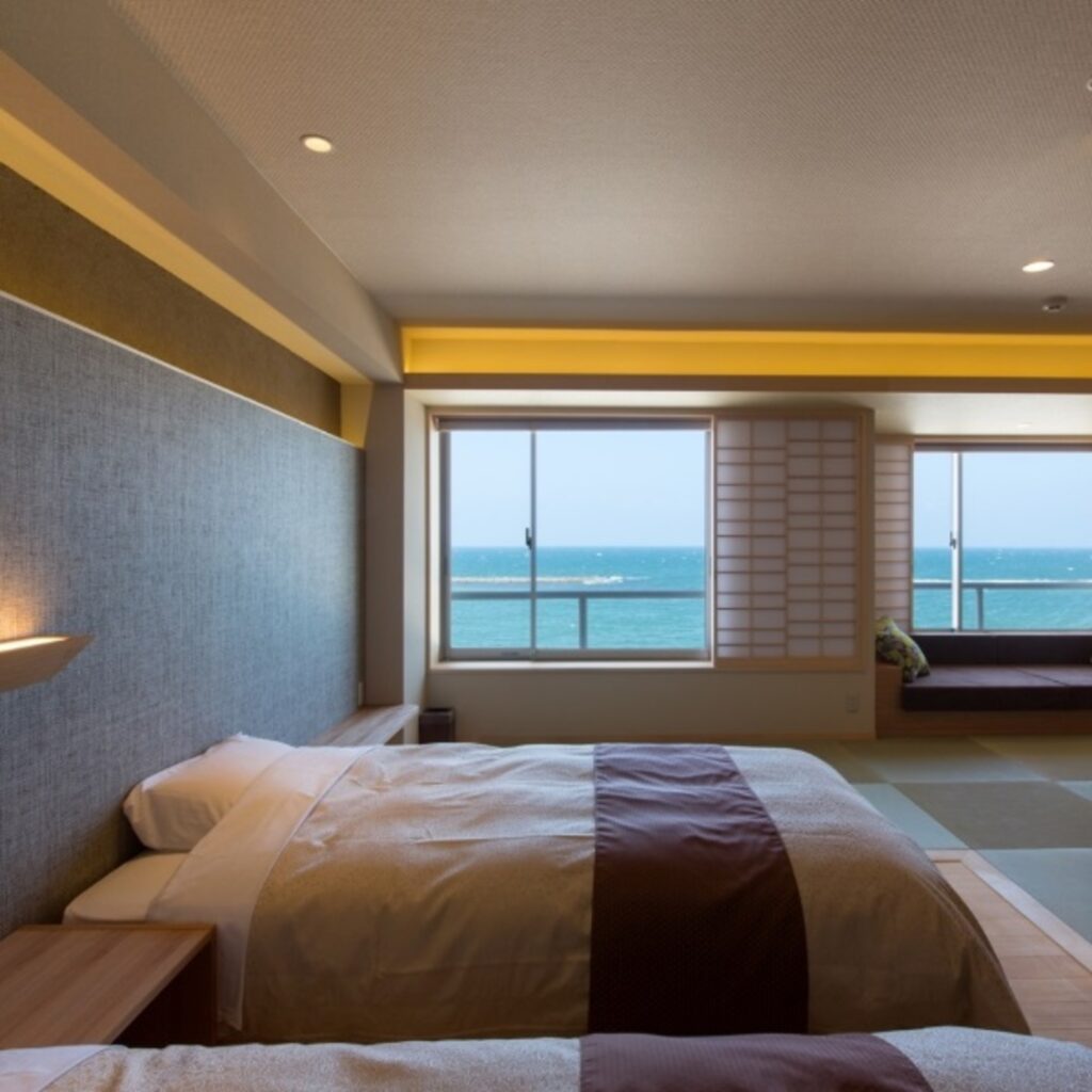 特に和モダンホライズンは、天水で最も海に近い部屋で、ベッドからも海の情景が見られて人気です。