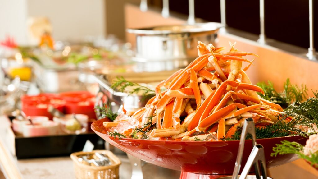 旅の楽しみの食事は、レストラン渚亭での和食を中心としたバイキング。