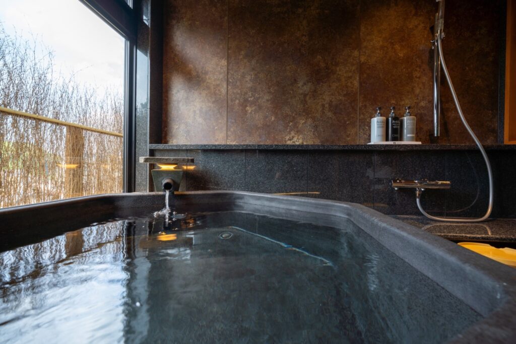 玄武岩はマグマからできた希少な岩石で、六角形の陶器風呂で贅沢な湯浴みができます。
