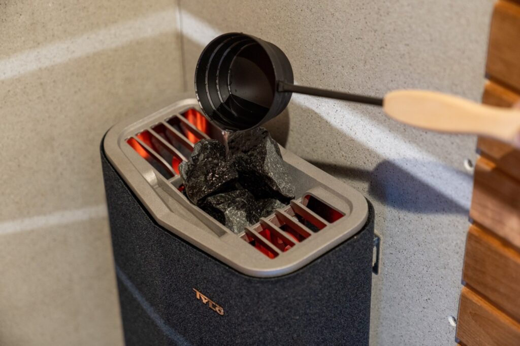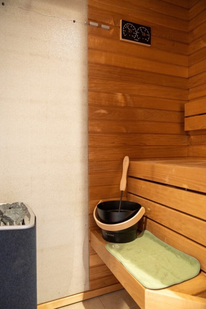 セルフロウリュウが楽しめる個室サウナと、露天風呂は桧の香りに包まれて、