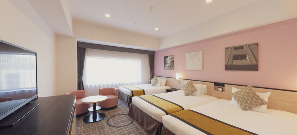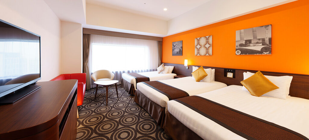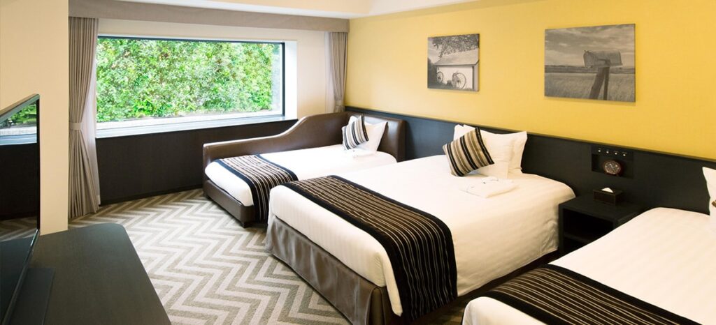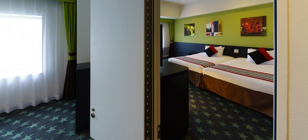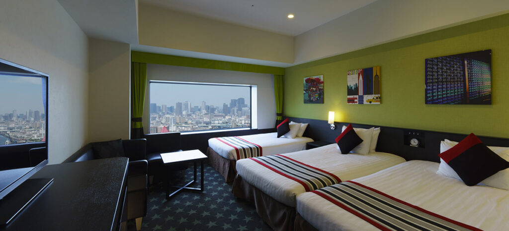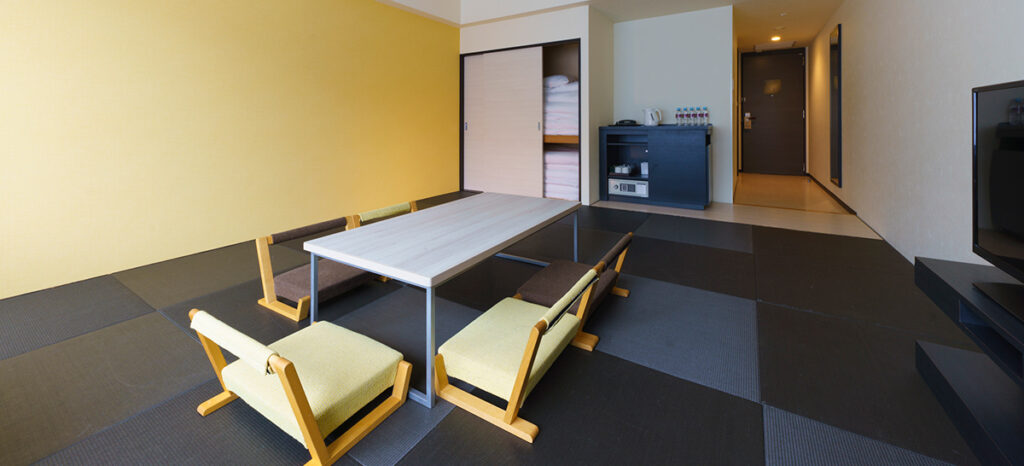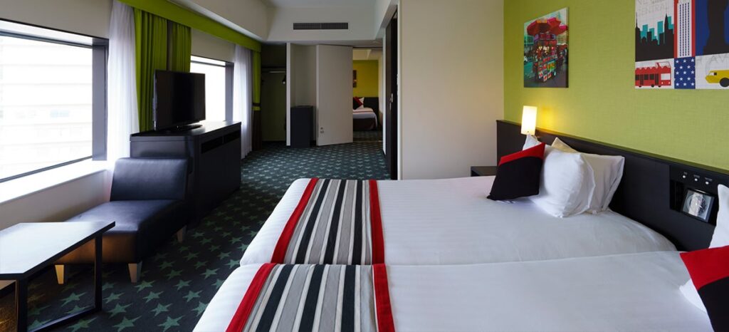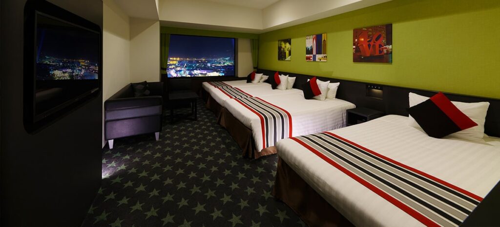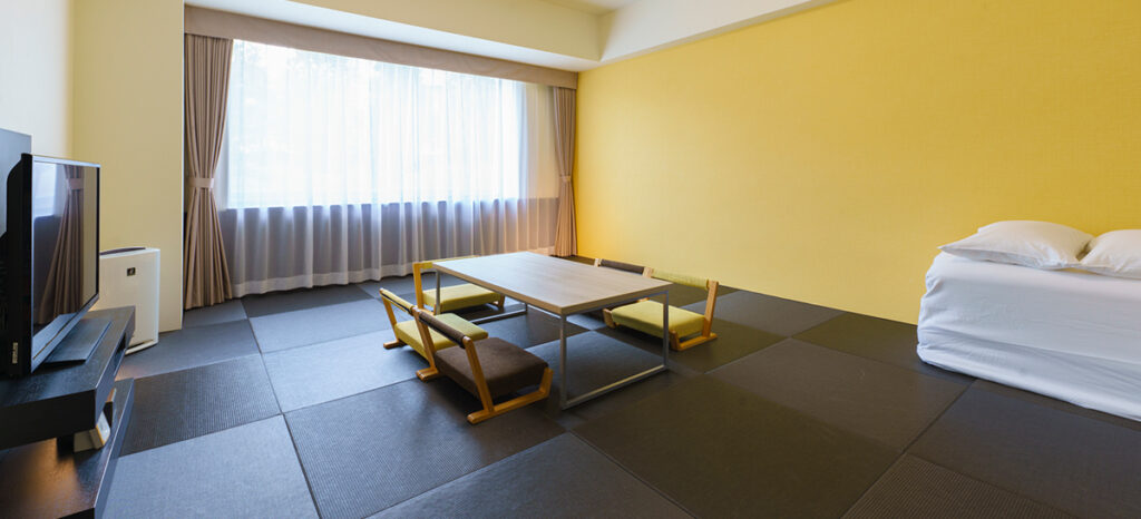 ん?和室?アメリカをテーマにしていてなんで?と思うのは置いておいて、4~7階だけに位置する広さ43.2㎡の畳敷きの和室です。4~5名で利用できるこのお部屋は、ホテル内に8室のみのユニークなジャパニーズ・スタイル。素足に心地よい畳の感触を楽しみながら布団を敷いて寝ることができます。赤ちゃん連れや、グループでわいわい楽しめる部屋です。