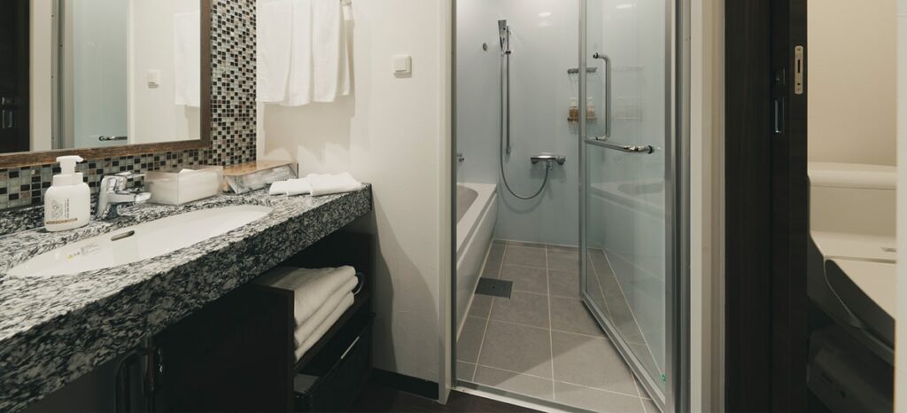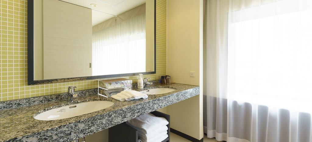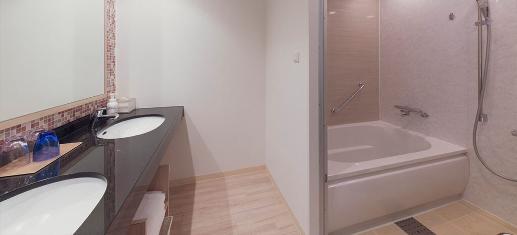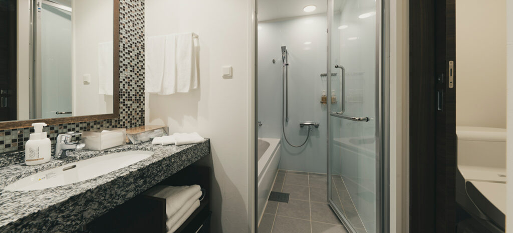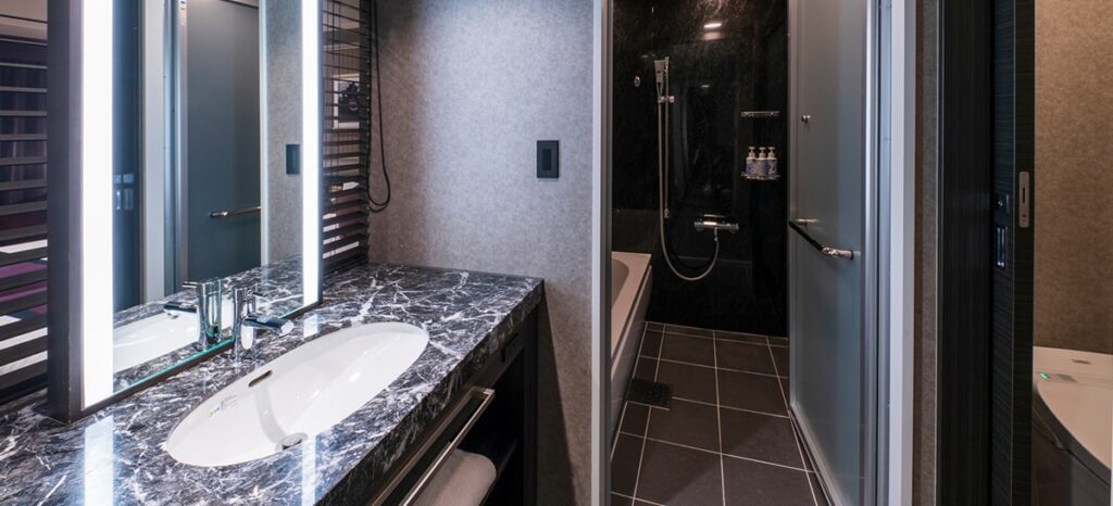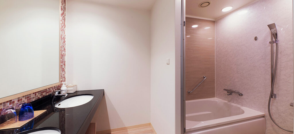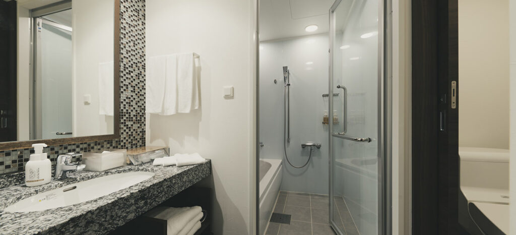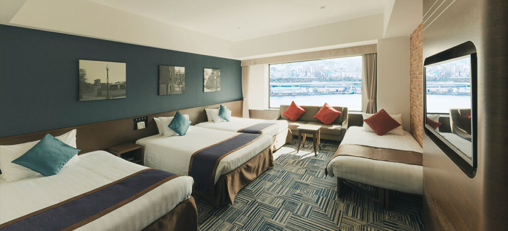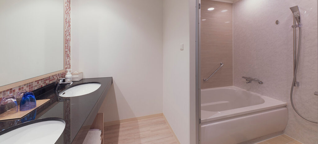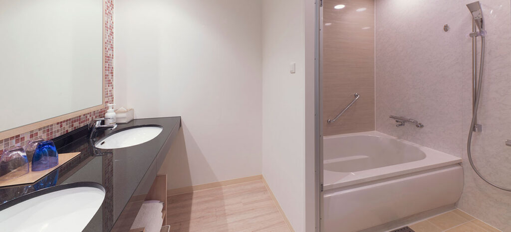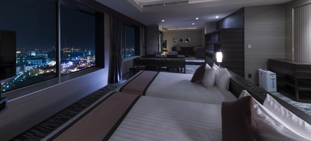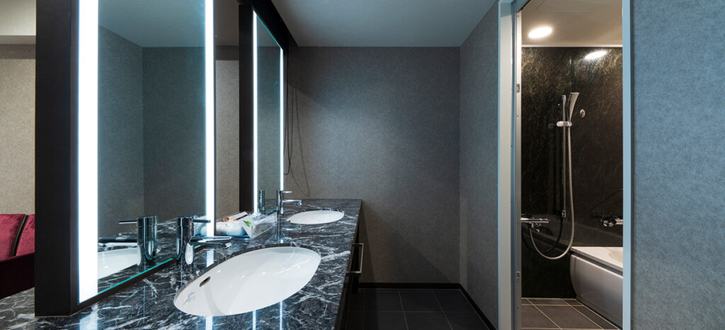 15~25階に位置する、広さ42㎡のゆったりとした明るい角部屋と隣り合う32㎡の部屋は、中扉を開けて最大6名様までご利用可能。洗い場付きのバスルームや、お手洗いが2つずつあるので、家族やグループでのお泊まりも快適です。