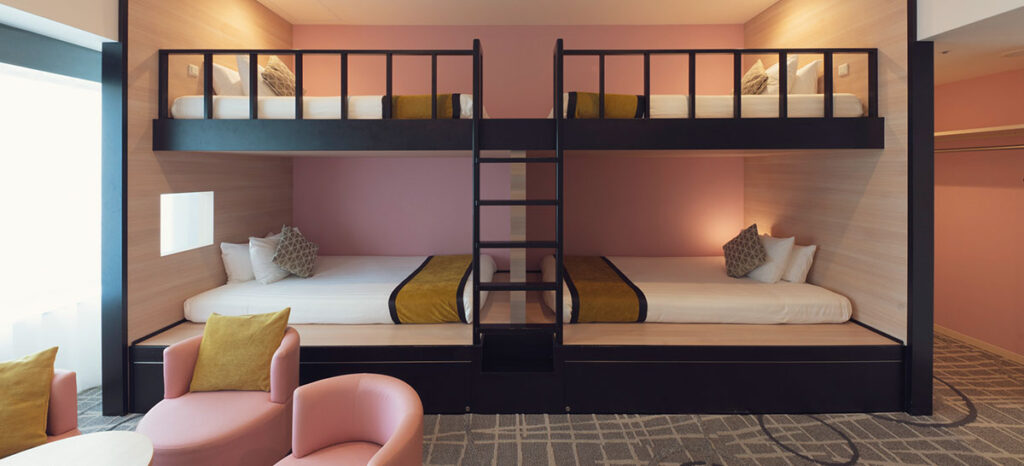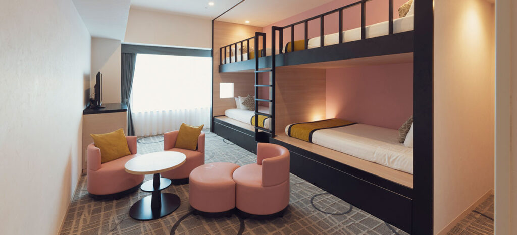 12~14階に位置する、2段ベッドの部屋。広さはゆったり目の43.2㎡で、最大5名までの利用が可能。部屋を分かれることなく、みんなで一緒にワイワイ楽しめます。グループ、家族連れ、女子旅にも特におすすめな部屋です。