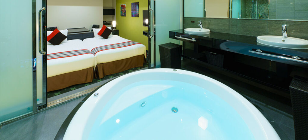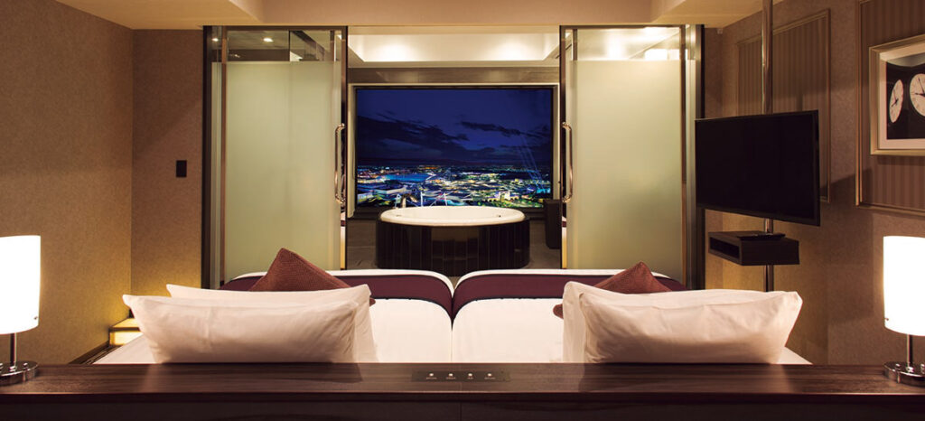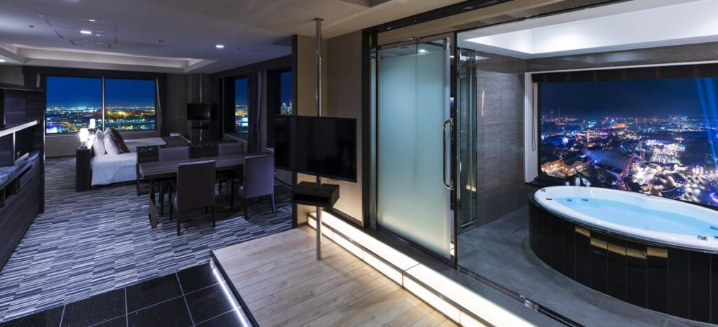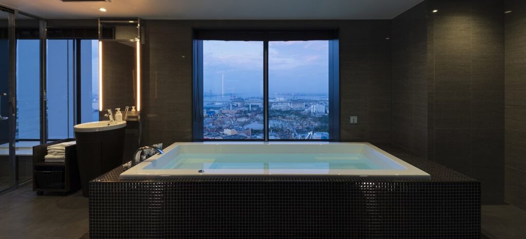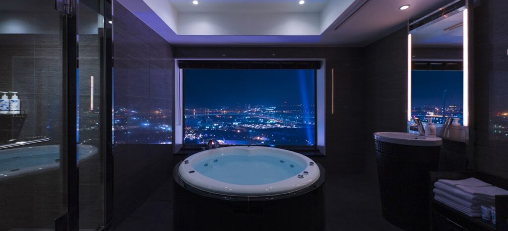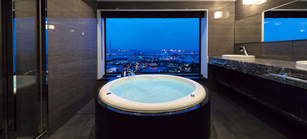 上層階26~27階に位置する、大きな窓から極上の景色が広がる「ビューバス」タイプ。パークの全景はもちろん、その向こうには天保山や神戸、はるか淡路島までを見渡せます。バスタイプはハート型と約3mのプールバスの2タイプがあります。