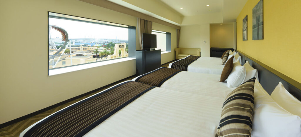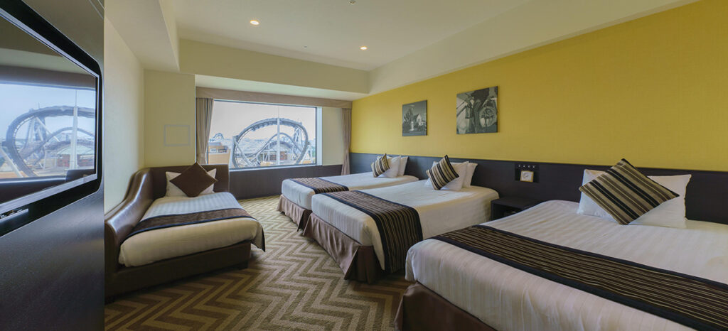 4~7階に位置する、広さ40~45.5㎡の部屋は、大人3~4名で沢山荷物を置いてもゆったり過ごせる空間です。大きな窓からはパーク内の景色がすぐ目の前に広がります。アトラクションの興奮が窓越しに伝わってくるほどの迫力は、低層階ならではの魅力です。