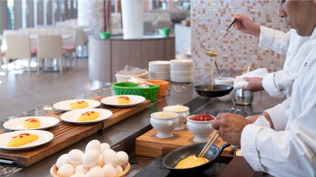 アーカラではオープンキッチンがあり、シェフが腕をふるっていて、ふわふわのオムレツを目の前で作ってくれます。