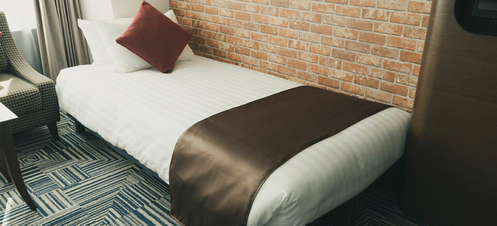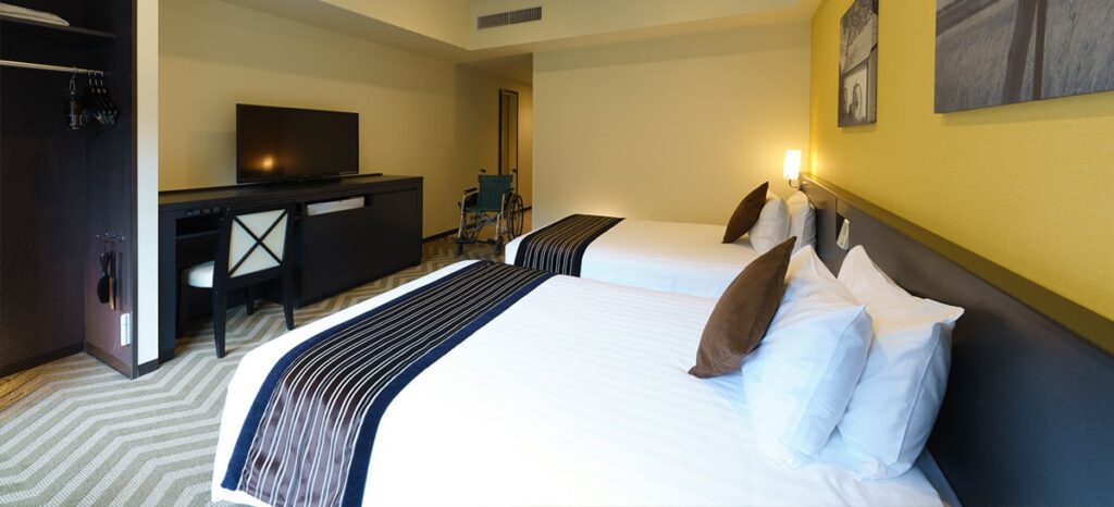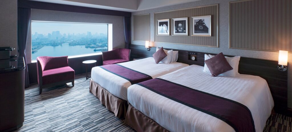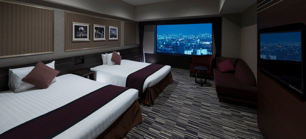 8~25階に位置する、広さ30~34㎡の部屋。2名~3名でご利用いただいてほどよい広さの客室です。バスルームは洗い場付き。ベッドは2台がピッタリとついたハリウッドタイプなので添い寝の子供連れでも快適なホテルステイが満喫できます。