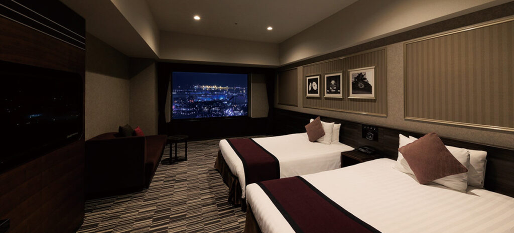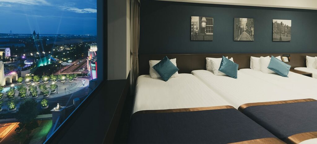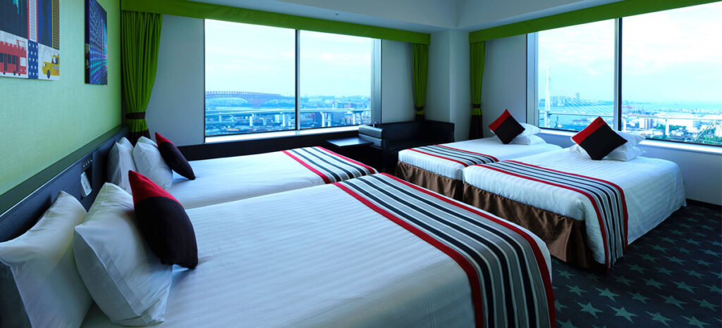 上層階26~28階に位置する、広さ約40㎡の部屋。ゆとりのある空間で、2~3名で快適に利用できます。全室眼下に広がるパークの景色はもちろんのこと、天保山の観覧車や神戸、そして淡路島までを臨む絶好のロケーション。寝ても覚めてもパークと一緒に過ごせるとっておきの部屋です。