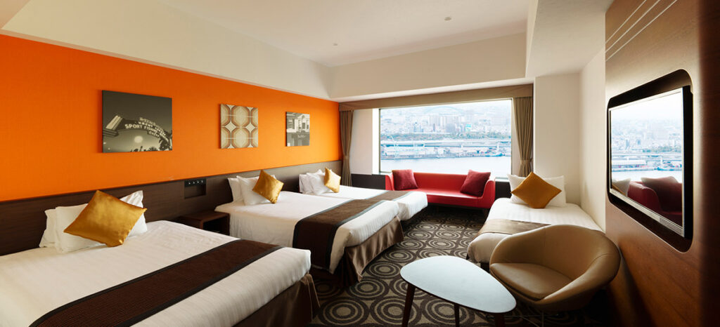 8~25階に位置する、広さ42~43.2㎡のゆったりとした部屋。大人4名でも広々とくつろげるスペースと快適さを追求したルームレイアウト。そして洗い場付のバスルームで一日の疲れを癒せます。ロケーションは大阪中心部を臨むシティサイド、六甲の山並が広がる六甲サイド、天気の良い日には和歌山の山並みまでが見えるリバーサイド側があります。