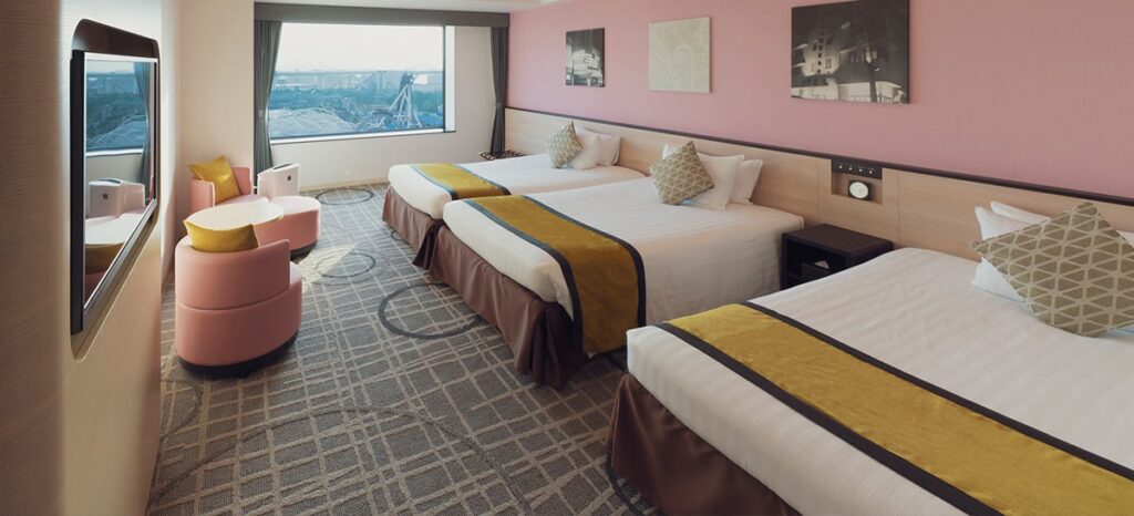 4~7階に位置する、広さ42~43.2㎡のゆったりとした部屋。大人3名でも、広々とくつろげるスペースと快適さを追求したルームレイアウト。そして洗い場付のバスルームで一日中遊んだ疲れを癒せます。大きな窓のある解放感たっぷりの空間は、家族やグループでのびのびと過ごせます。