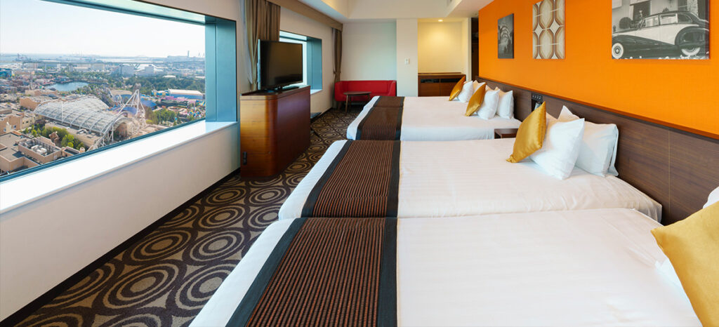 8~25階に位置する、広さ40.0~45.5㎡の部屋で2~4名様まで滞在できるので家族連れやグループにピッタリです。室内の大きな窓からは、すぐ目の前に広がるパーク内の景色を一望できます。パーク内のアトラクションが手に取るように望める、迫力満点の眺望です。